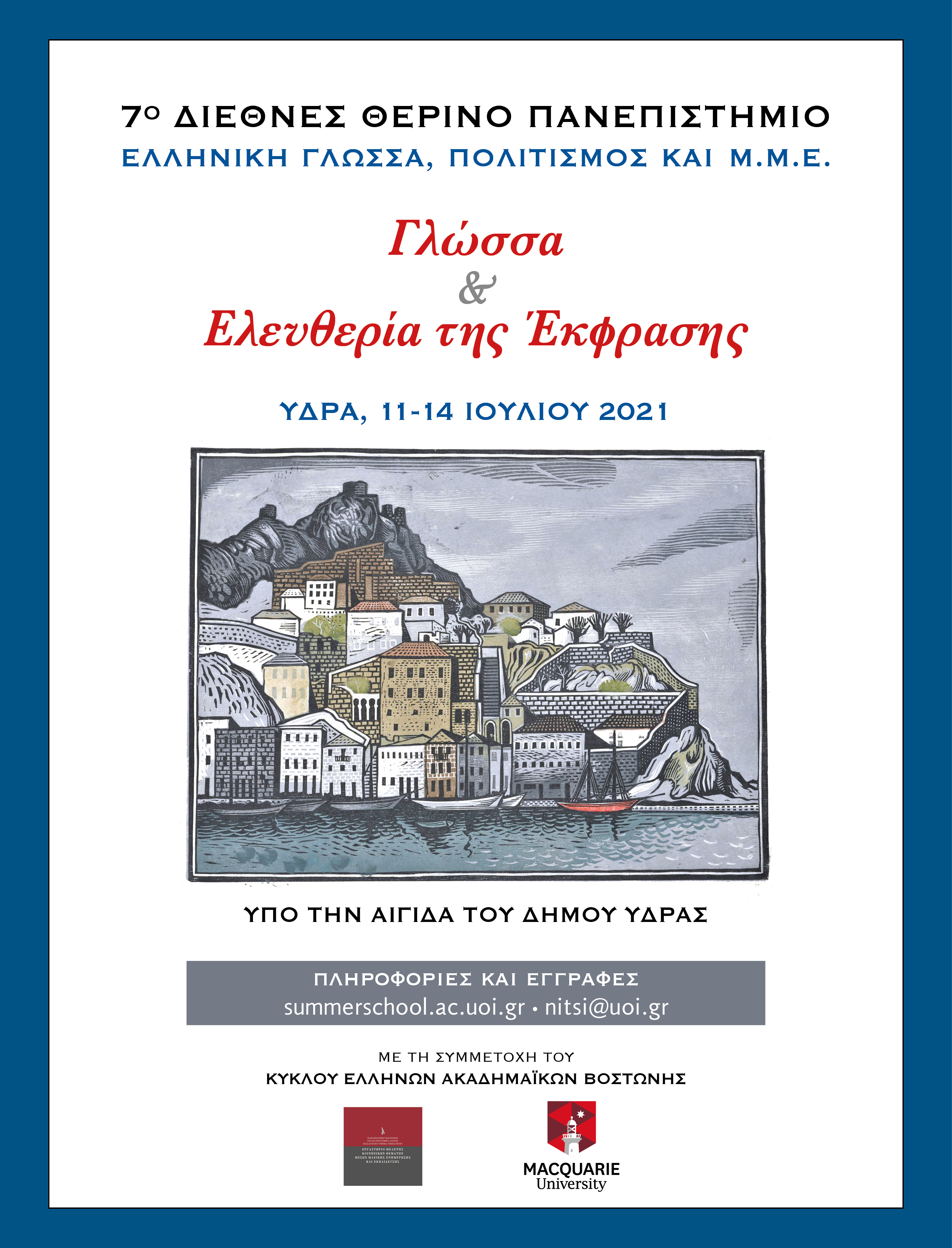 Με τη συμμετοχή Πρυτάνεων και πανεπιστημιακών Καθηγητών, αλλά και εκπροσώπων του Τύπου από την Ελλάδα, την Κύπρο, την Αμερική και την Αυστραλία, πραγματοποιήθηκε η διαδικτυακή, επίσημη παρουσίαση του 7ου Διεθνούς Θερινού Πανεπιστημίου «Ελληνική Γλώσσα, Πολιτισμός και ΜΜΕ» που οργανώνει το Εργαστήριο Μελέτης Κοινωνικών Θεμάτων, ΜΜΕ και Εκπαίδευσης του Παιδαγωγικού Τμήματος Νηπιαγωγών της Σχολής Επιστημών Αγωγής του Πανεπιστημίου Ιωαννίνων, σε συνεργασία με το Πρόγραμμα Νεοελληνικών Σπουδών του Τμήματος Μέσων Μαζικής Ενημέρωσης, Επικοινωνίας, Καλών Τεχνών, Γλωσσών και Λογοτεχνίας της Σχολής Ανθρωπιστικών Σπουδών του Macquarie University (Department of Media, Communications, Creative Arts, Language and Literature, Faculty of Arts), στο Σίδνεϊ της Αυστραλίας, με τη συμμετοχή του Κύκλου Ακαδημαϊκών της Βοστώνης (The Circle of Hellenic Academics in Boston). Η δράση προγραμματίζεται να πραγματοποιηθεί στην Ύδρα από 11-14 Ιουλίου 2021 (εφόσον οι συνθήκες το επιτρέπουν), στην αίθουσα τέχνης και συναυλιών "Mελίνα Mερκούρη", καθώς και μέσω διαδικτυακής πλατφόρμας. Το Διεθνές Θερινό Πανεπιστήμιο εντάσσεται στο επετειακό πρόγραμμα για τα 200 χρόνια από την Ελληνική Επανάσταση και τελεί υπό την αιγίδα του δήμου Ύδρας. Υποστηρίζεται επίσης από τη Γενική Γραμματεία Δημόσιας Διπλωματίας και Απόδημου Ελληνισμού του Υπουργείου Εξωτερικών, όπως ανακοίνωσε ο Γενικός Γραμματέας κ. Γιάννης Χρυσουλάκης, ο οποίος εξήρε τον θεσμό και τους έμψυχες συντελεστές του. Το 7ο Διεθνές Θερινό Πανεπιστήμιο φέρει φέτος τον ειδικότερο τίτλο «Γλώσσα και ελευθερία της έκφρασης».